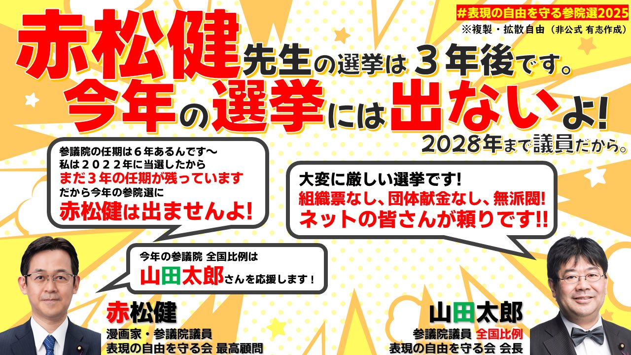 Q: 前回の山田太郎議員、赤松健議員は50万票以上という大量の得票で当選していますが、他の表現の自由を標榜する議員に一部票を回して議員数を増やすべきではないでしょうか?