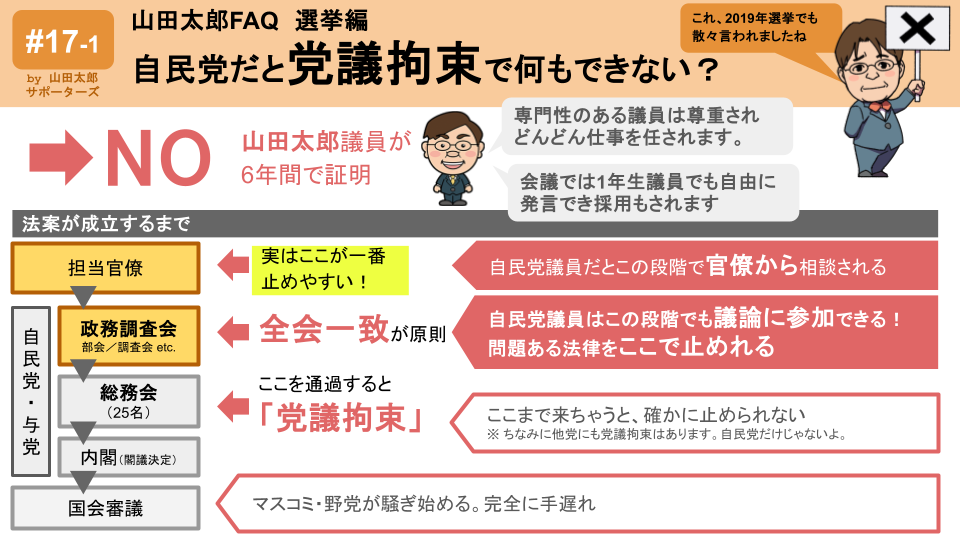 Q: 自民党だと党議拘束で山田太郎議員は何も出来ないと聞きました。本当でしょうか?