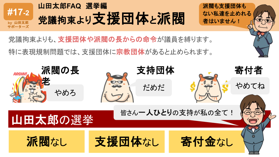 山田太郎議員はたくさんの法案を作る議員なので、むしろ党議拘束によって自らの法案を成立させることができ、メリットの方が上回っているかもしれません。