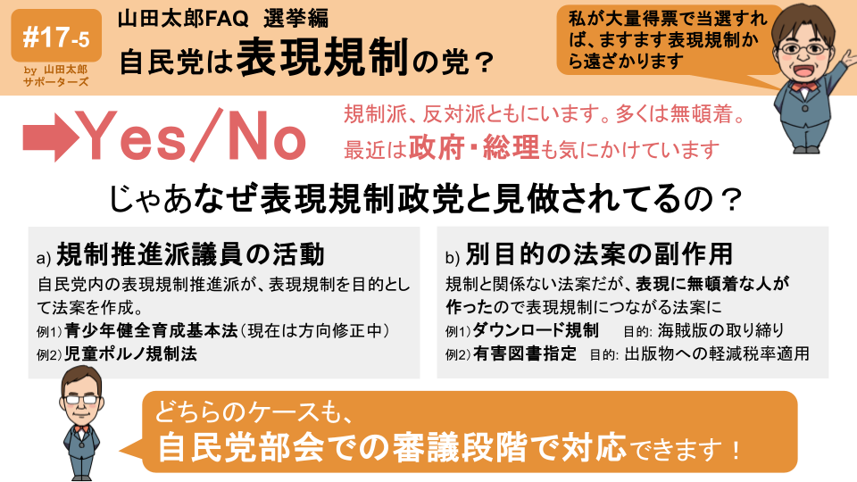 A: 確かに山田太郎議員が自民党に入った時点では表現規制勢力の強い党でした。