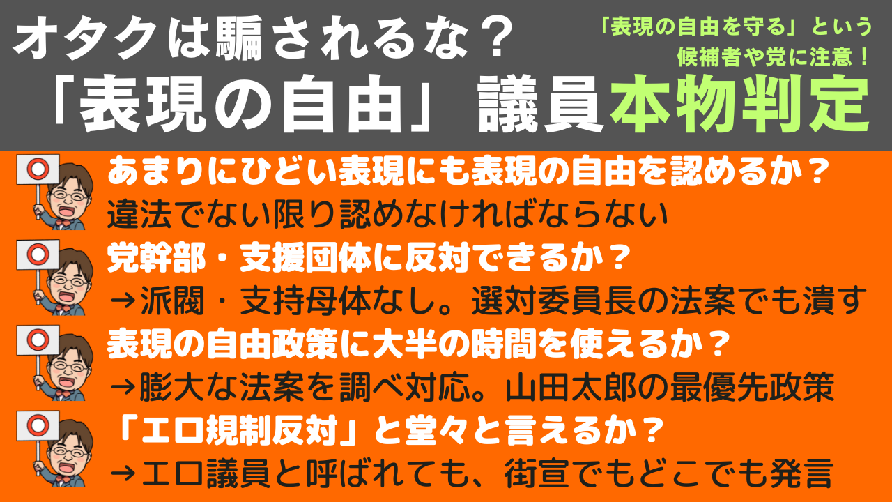 A: 山田太郎議員を推している当サイトとしては山田議員に入れていただきたいところですが、表現の自由を守ってくれる議員が増えることは喜ばしいことです。