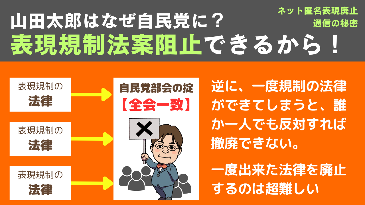 しかし、自民党(与党)に入ることは、表現の自由を守るうえで非常に大きなメリットもあります。