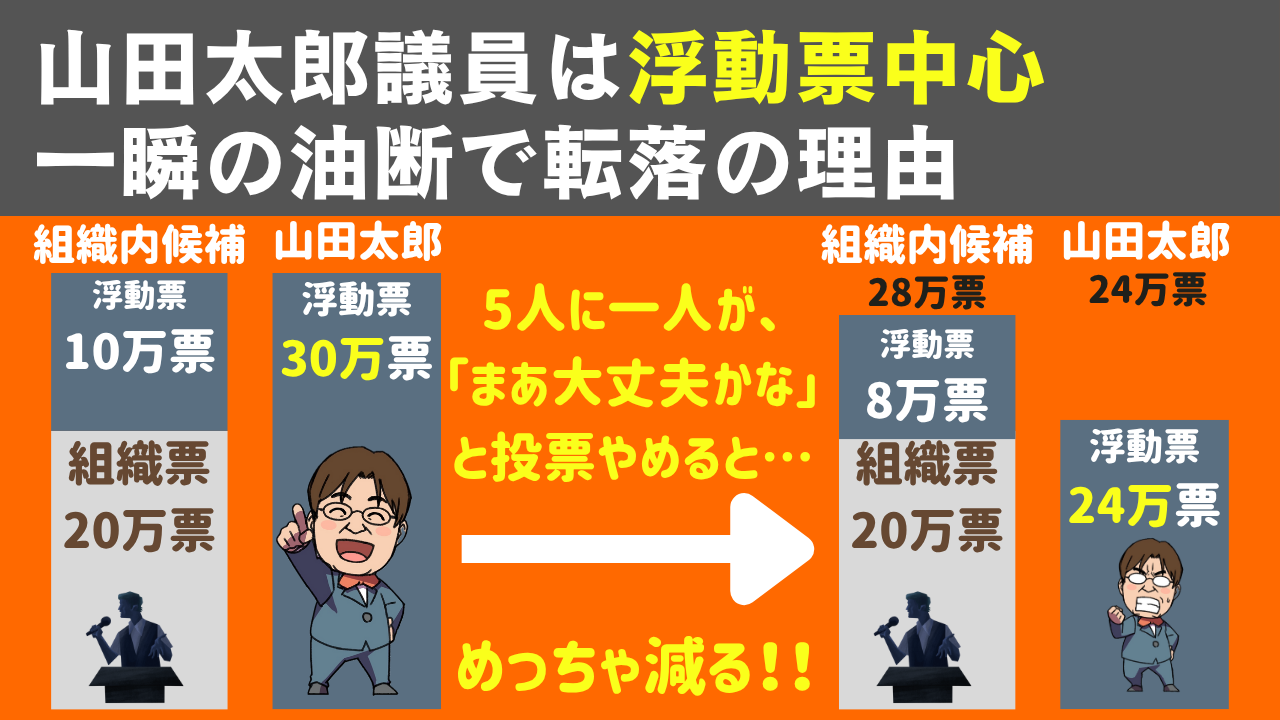 一方、山田太郎議員は支援団体を持たないため、票読みが極めて困難で、ブレが大きくなります。
