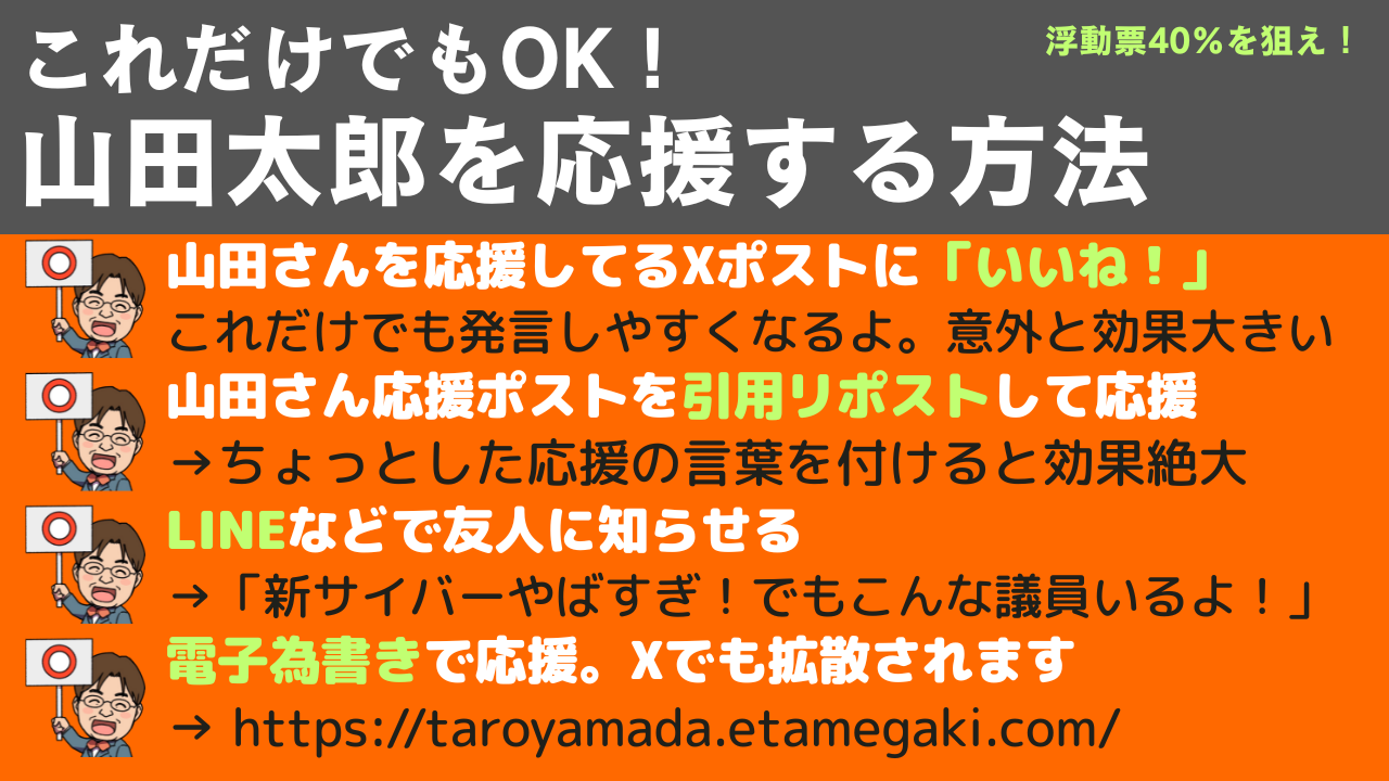 A: 公式ホームページに応援方法がまとめられていますので、ご覧いただきぜひお力をお貸しください。Xで山田太郎議員をフォローしたりリポストしたりと、簡単なことから始めることができます。