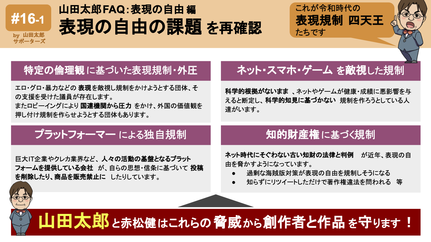 Q: 山田太郎議員が与党自民党の議員になったことで表現の自由の問題は無くなったの?