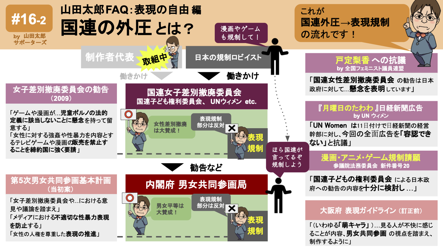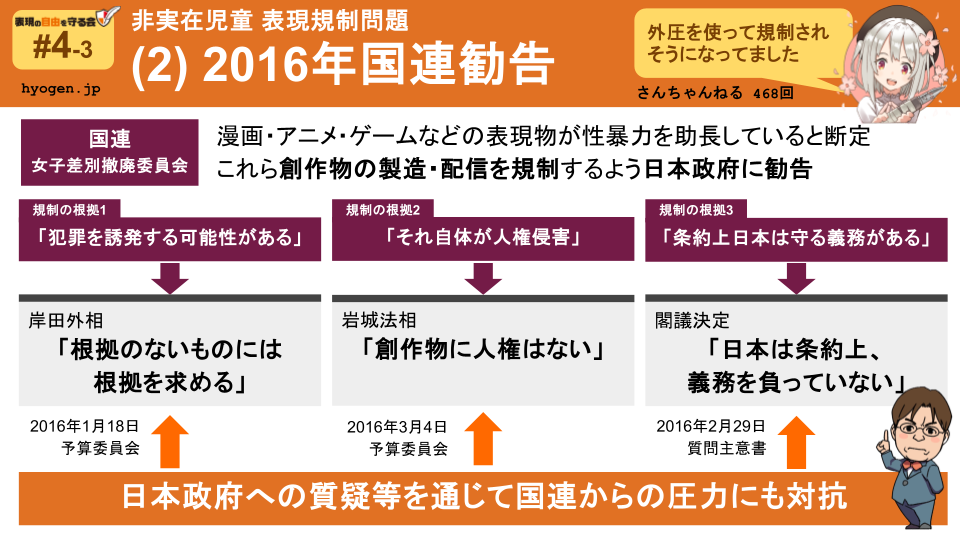このとき女子差別撤廃委員会は漫画・アニメ・ゲームなどの表現物が性暴力を助長していると断定し、これら創作物の製造・配信を規制するよう日本政府に勧告してきました。
